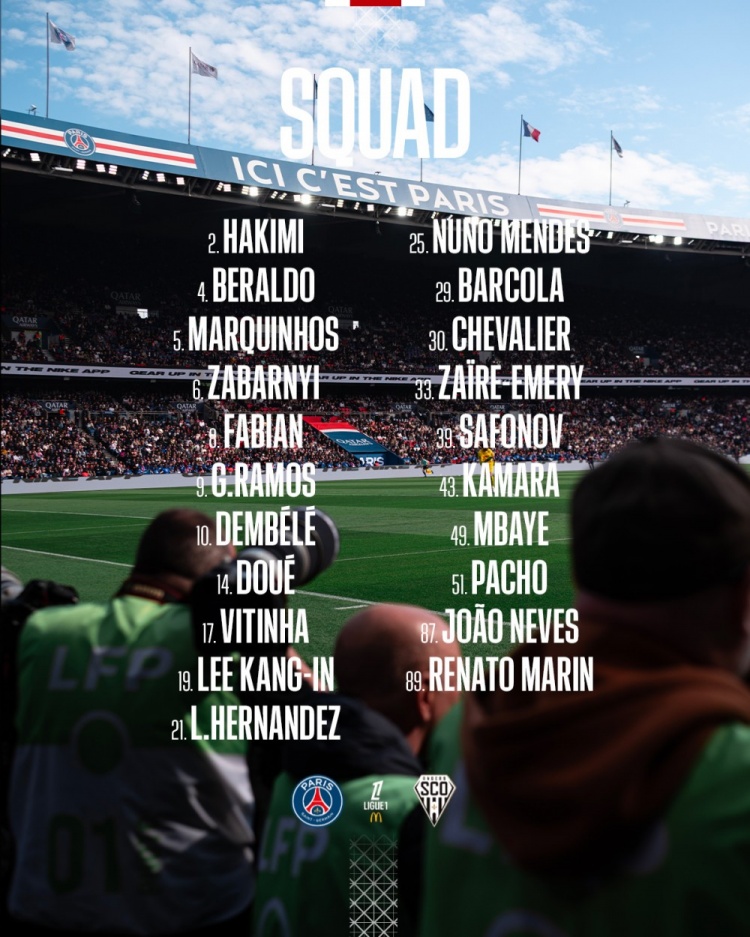 北京时间8月23日凌晨2点45分,巴黎圣日耳曼将坐镇主场迎来法甲第二轮与昂热的对决。球队官方公布了本场比赛大名单,门将多纳鲁马依然缺席,新援克瓦拉茨赫利亚也未进入名单。