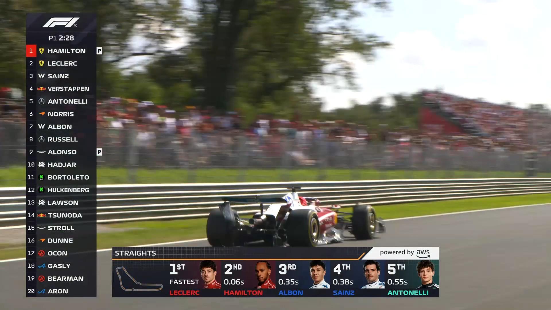 北京时间9月5日,在稍早结束的F1意大利大奖赛第一次练习赛中,汉密尔顿全场最快,勒克莱尔、塞恩斯位居二三。维斯塔潘第4,安东内利第5,诺里斯第6,阿尔本第7,拉塞尔第8,阿隆索第9,哈贾尔第10,邓恩第16,保罗-阿隆第20。