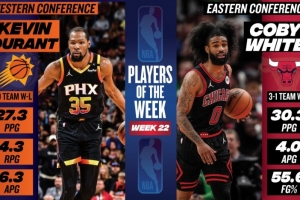 体育资讯3月25日讯 今日NBA官宣布,太阳球星凯文-杜兰特和公牛后卫科比-怀特被评为本赛季第22周NBA西部和东部周最佳球员。