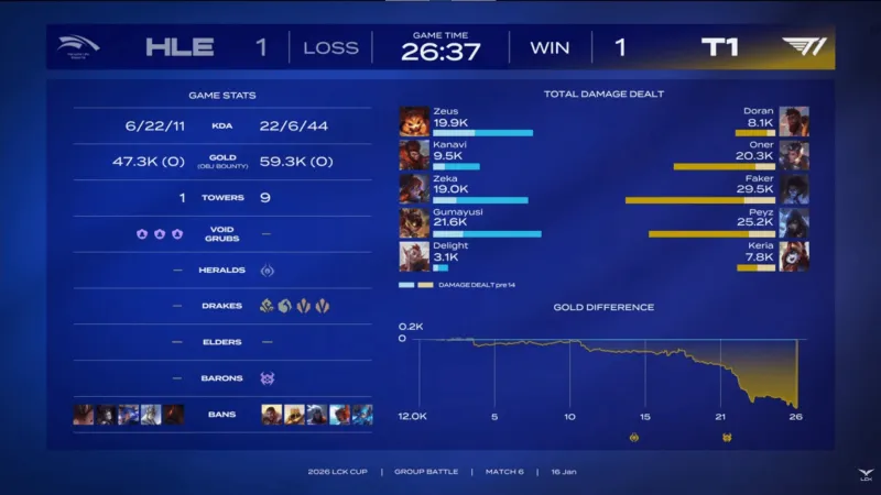 比赛第22分钟,T1抓掉Zeus纳尔后拿下大龙,随后中路打出0换4大胜HLE→