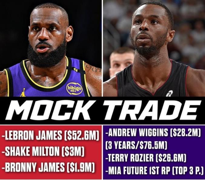 交易的具体内容是:湖人送出:詹姆斯父子+米尔顿;得到热火的:维金斯+罗齐尔+未来1首轮(前三保护)